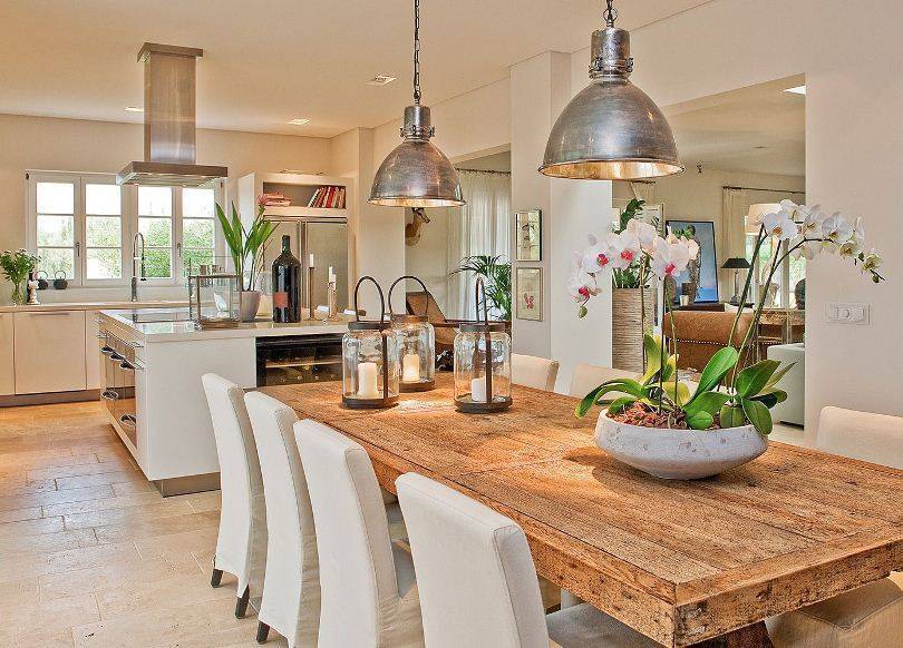 В обстановку гармонично впишутся живые растения, цветы в вазе или горшочке. Стол декорируют блюдом с фруктами. На стенах размещают маленькие картины, постеры или часы, а также расставляют в комнате красивую посуду и другие аксессуары.