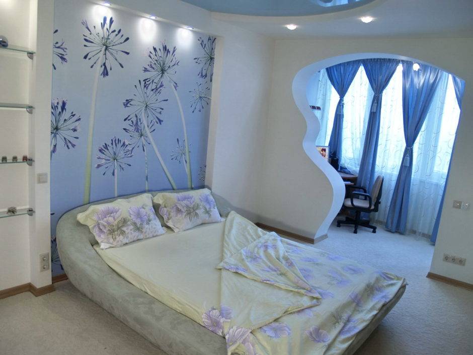 Если изначальное состояние потолка не имеет неровностей, трещинок и прочего, для отделки можно выбрать краску или обои. При наличии дефектов, подойдет установка натяжных систем или разноуровневых подвесных конструкций. Иногда, одну часть потолка оборудуют объемным гипсокартонным коробом, а в другой применяют натяжное полотно, за счет чего создается зонирование спальни и она приобретает более пропорциональный вид.