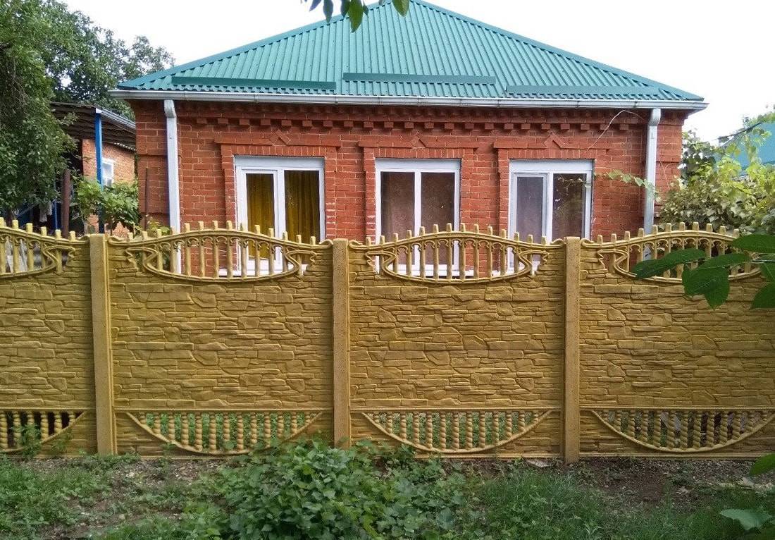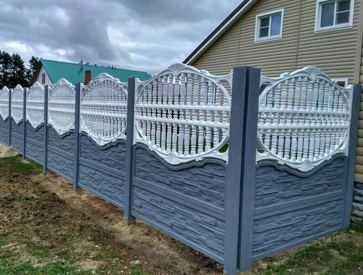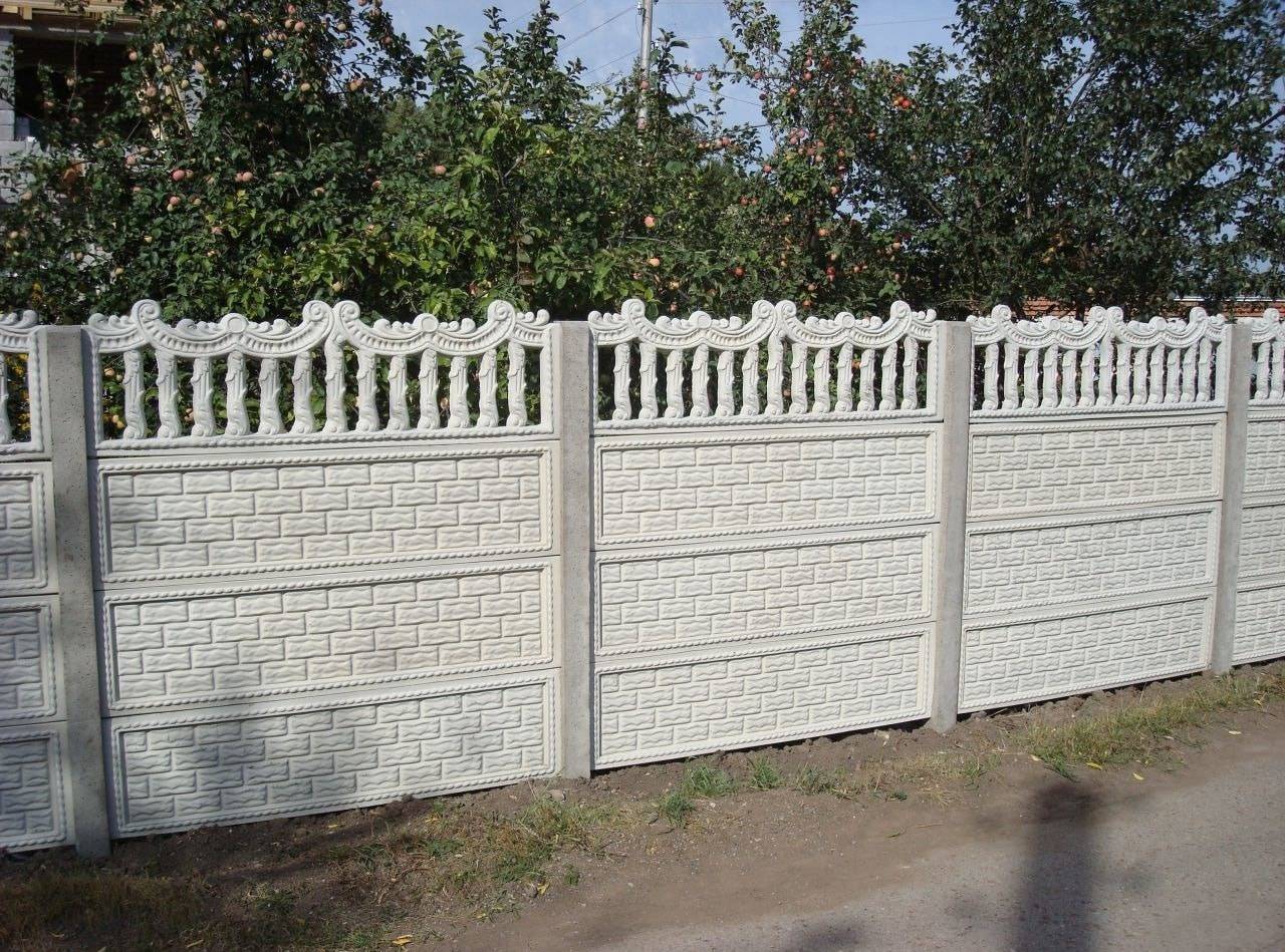 Популярны тем, что прочны и хорошо выглядят. В продаже бетонный забор представлен в виде готовых секций, стандартных размеров – они могут быть сплошными или ажурными – здесь все зависит от пожеланий покупателя. Как сплошные, так и ажурные секции, могут иметь различный дизайн под камень, кирпич, в виде цветов, различных орнаментов и тому подобные. Как правило, обычно подбирают две или три сплошные секции, а сверху – одну ажурную – она делает конструкцию визуально легкой и красивой.