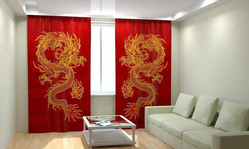 Сочетание красного цвета с оттенками золотого применяется традиционно. Это цвета роскоши. Шторы, украшенные золотым орнаментом, считаются классикой. Декорировать такими портьерами лучше всего гостиную или залу для приема гостей.