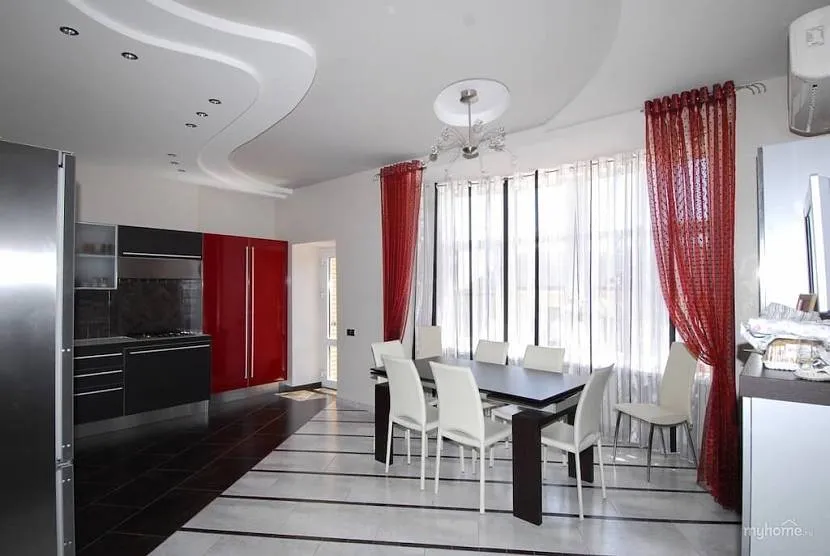 Поскольку эта комната является многофункциональной, использовать красные шторы для кухни следует с осторожностью. Излишне выразительные и яркие тона необходимо погасить другими оттенками: серым, белым, бежевым