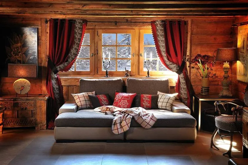 - Гостиная с бордовыми шторами может быть выполнена и в стиле кантри, где предпочтительны натуральные ткани. Это могут быть гардины в клетку, полоску или же в цветочек.