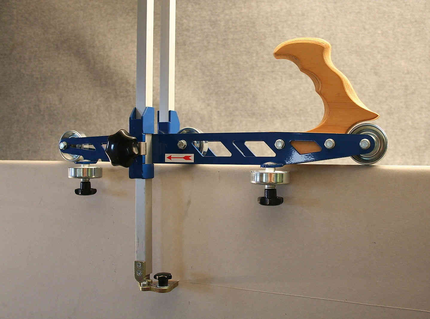- Самодельное устройство из дерева похожее на швабру. Для этого вертикальная палка должна быть не менее 1,5 м, горизонтальная равна ширине листа. Горизонтальная рейка должна быть гладкой, чтобы не повредить материал. Её приставляют к зафиксированному материалу. Причем вертикальную рейку фиксируют на полу (чтобы был упор).