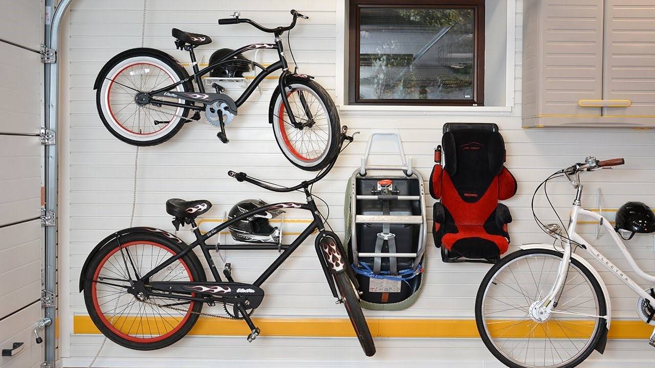 Для небольших гаражей подходят настенные крепления. Фиксаторы крепятся на разном расстоянии, а транспорт подвешивается за раму. Вешать велосипед можно так, чтобы рама была вертикально или перпендикулярно стене. Устанавливают крюки, полки или кронштейны.