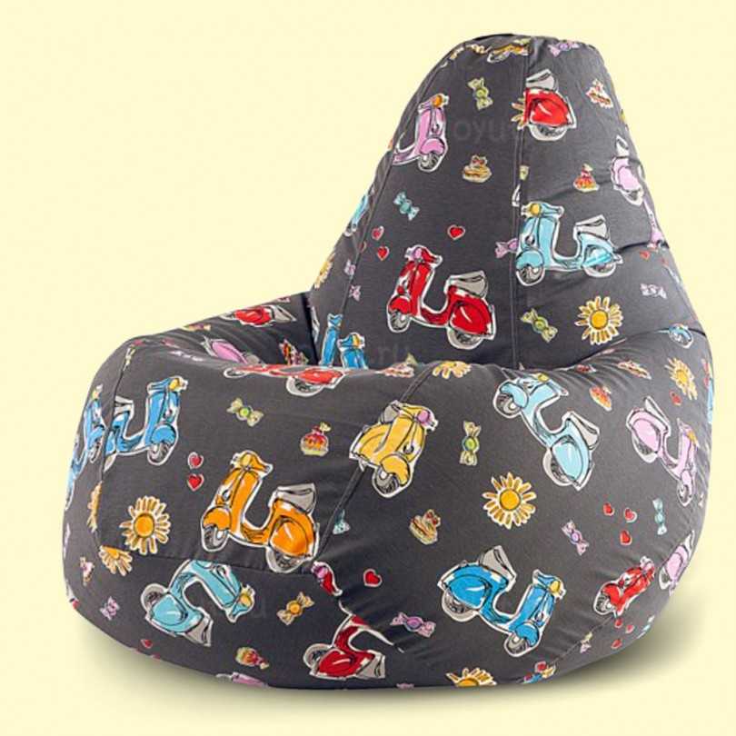 Если пошив кресла предназначен для обустройства детской комнаты, его оформление может быть выполнено в разных ярких и веселых расцветках – с принтами, в горошек, цветочек и др. Мягкий пуфик груша можно также украсить декором в виде любимых героев детских мультфильмов.