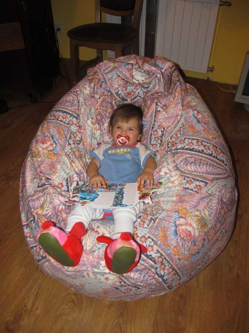 Ну вот, мы дошли до финальной стадии, когда натягиваем чехол и получаем красивое готовое кресло. Изделие получилось весьма тяжелым, зато детям будет полностью безопасно, можно отнести к плюсам. Что касается используемой ткани, то тут ничего нигде не покупалось. Использовались имеющиеся дома лоскутки и остатки от шитья.