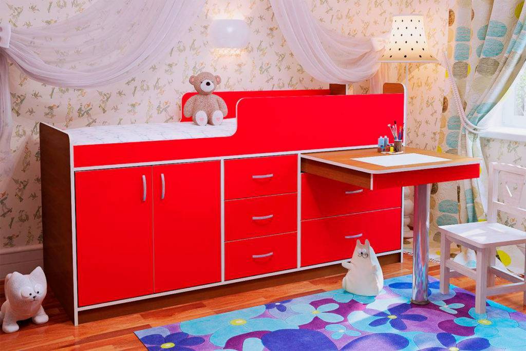Мебельные модули бывают разных размеров. Для малышей дошкольного возраста лучше приобрести мебель метровой высоты. Спальное место оборудовано бортиками, так что малыш будет чувствовать себя наверху безопасно. Внизу — игровая площадка, шкафчики для игрушек, небольших вещей.