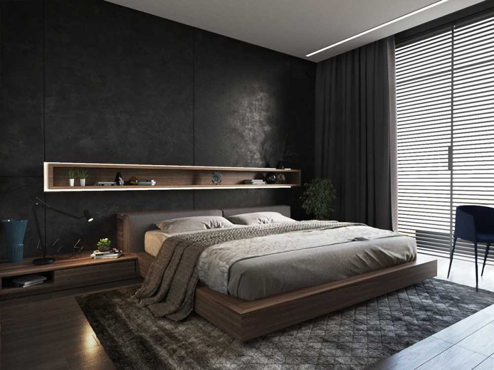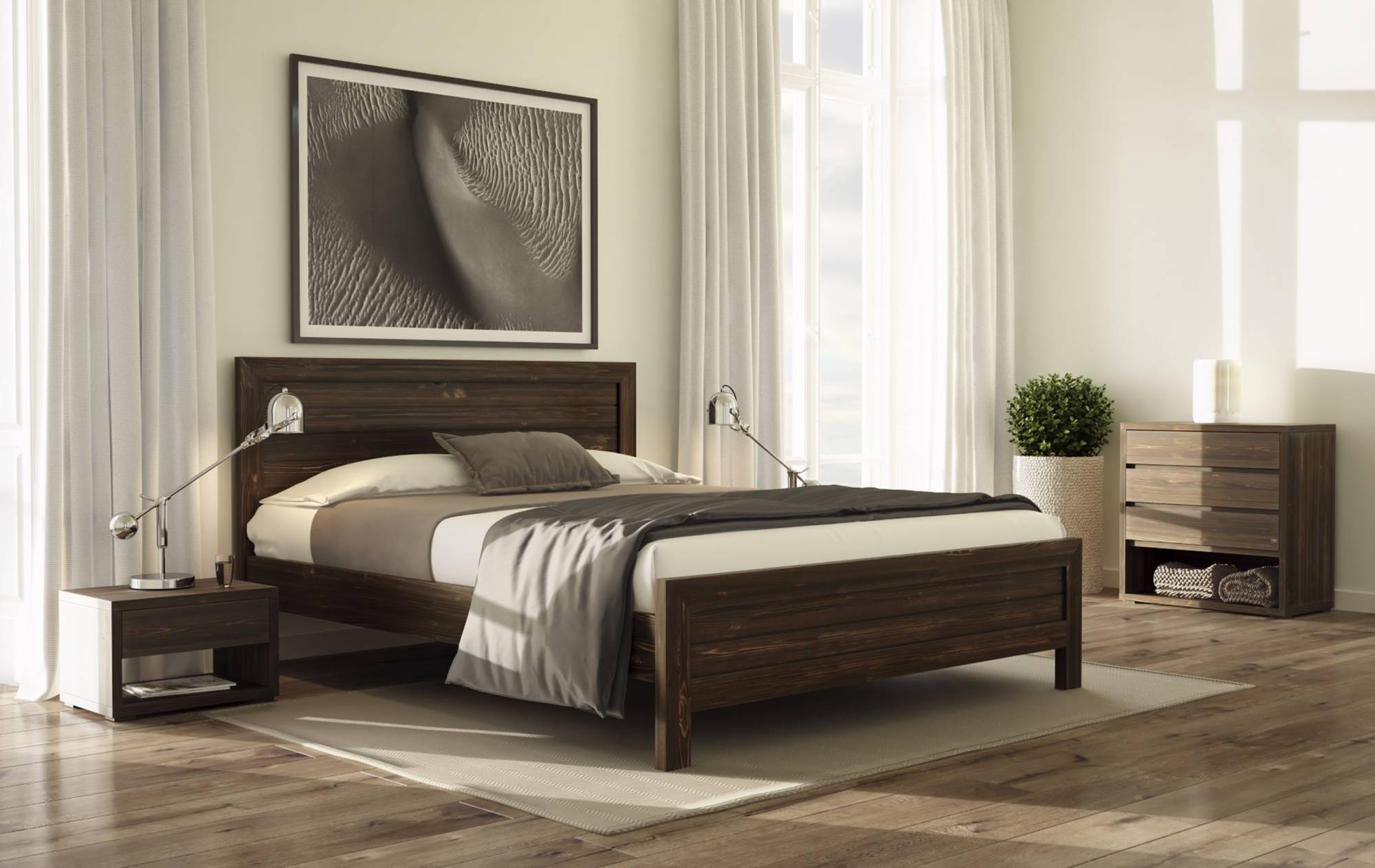 Кровать из тёмного дерева будет органично сочетаться со светлыми полутонами интерьера