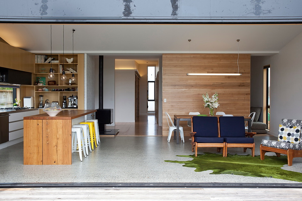 Разделение помещения на гостевую и обеденную зону при помощи небольшой декоративной стены