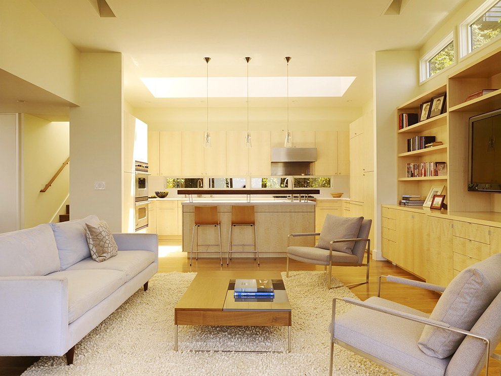 Часто дизайнеры интерьеров применяют для зонирования разные типы освещения. Пространство кухни всегда должно иметь максимальное количество света, для удобства и безопасности. В зоне отдыха достаточно нескольких точек, торшеров или бра. В месте приема гостей желательно включать верхний свет.
