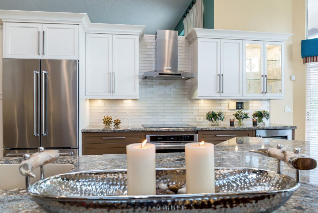 Вы можете использовать слоновую кость на кухне по-разному. Как вы видите на фото выше, оттенки слоновой кости используются на верхних шкафах, плиточном фартуке и даже на акцентных свечах.