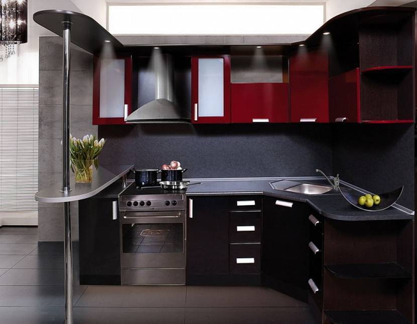 Бордовый цвет в интерьере кухни дизайнеры рекомендуют сочетать с оттенками черной палитры. Изящный графитовый в декоративных деталях смотрится красиво и аристократично. Если помещение оформили в светлой гамме с глубоким тоном, то столовый гарнитур выполняют в насыщенном древесно-угольном решении.