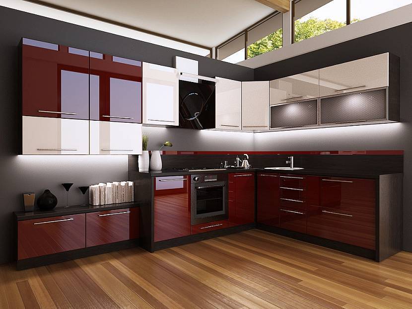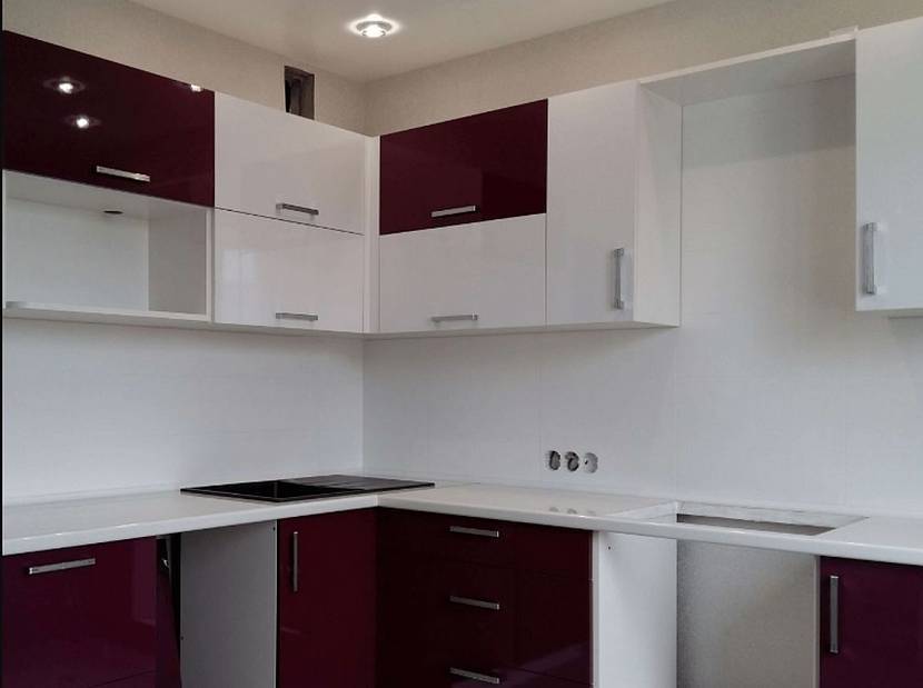 Если в интерьере нужно связать несколько цветов, то используют бордово-белую композицию. В качестве фона берут светлый тон, а глубокий оттенок привносит изюминку в дизайн. Контрастные переходы выигрышно смотрятся на глянцевых фасадах гарнитура. На мебели с матовыми дверцами насыщенная палитра выглядит приглушенной.