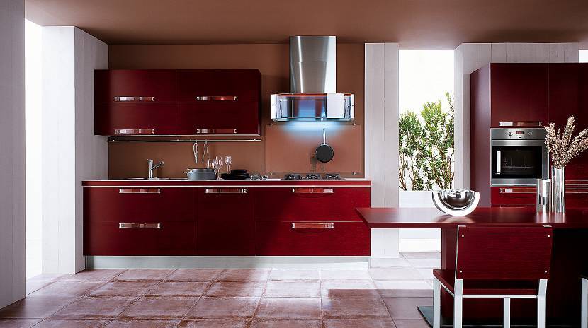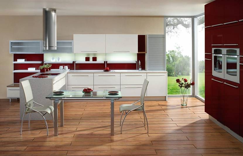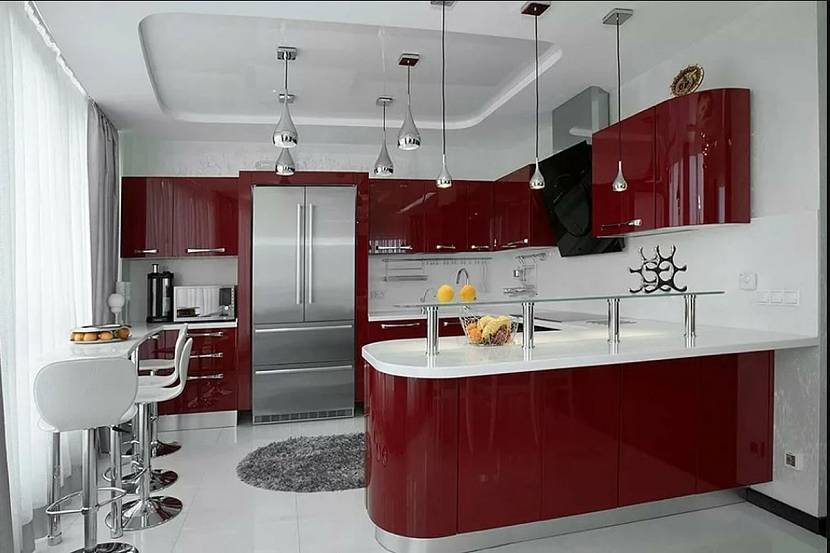 Бордовый цвет в интерьере белой кухни поможет зрительно увеличить маленькую комнату. Стены и нижние фасады мебели выполняют в снежном, а верхний уровень (полки, подвесные тумбы) – в глубоком винном. Из-за ощущения невесомости в комнате приподнимается низкий потолок, а предметы визуально не давят.