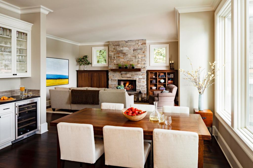 Желая воссоздать в своей кухне-гостиной этот стиль, необходимо стремиться к мягкости, уюту и спокойствию в интерьере, а также четкости и симметрии. При его создании важны материалы, из которого изготовлены обивка и фасады мебели, обрамление камина и прочее.