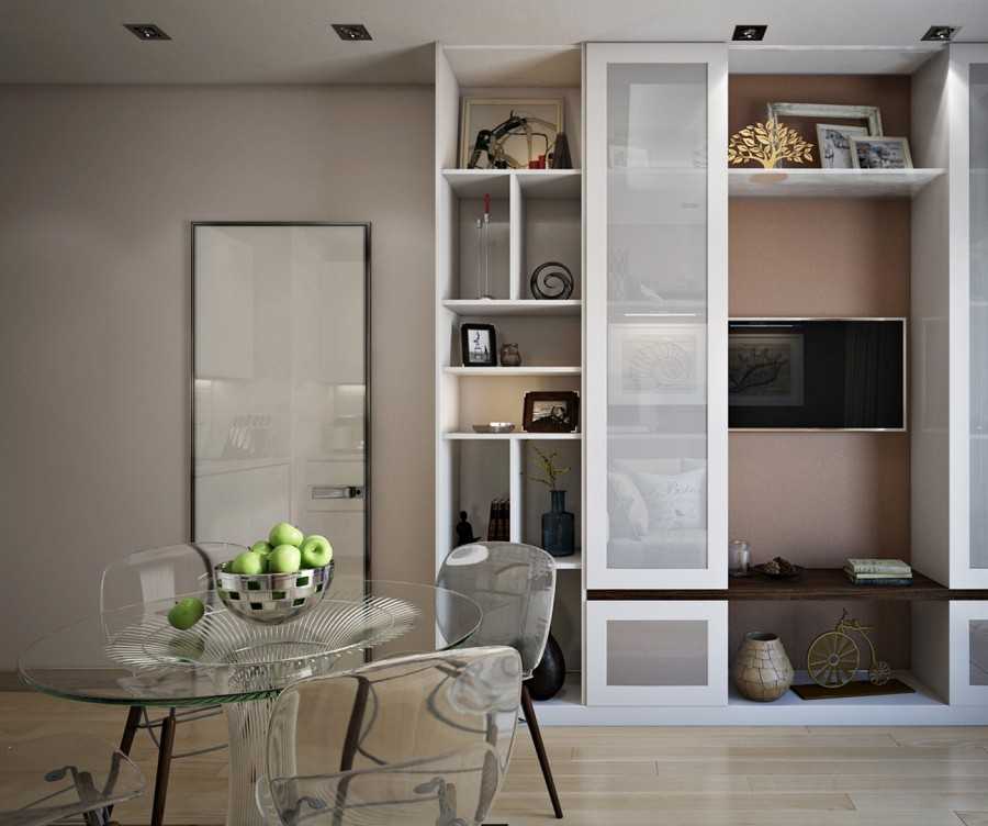 Трансформирующаяся мебель – это новинка последних лет. Она свободно передвигается по всей площади кухни-гостиной, имеет оригинальный дизайн и выполняет множество функций. Компактные габариты данной мебели делают ее незаметной в интерьере на 18 квадратов, в случае необходимости она выдвигается и задвигается. В секциях можно спрятать бар-холодильник, стол со стульями, постельное белье и другие предметы. Единственным минусом такой мебели является высокая цена.