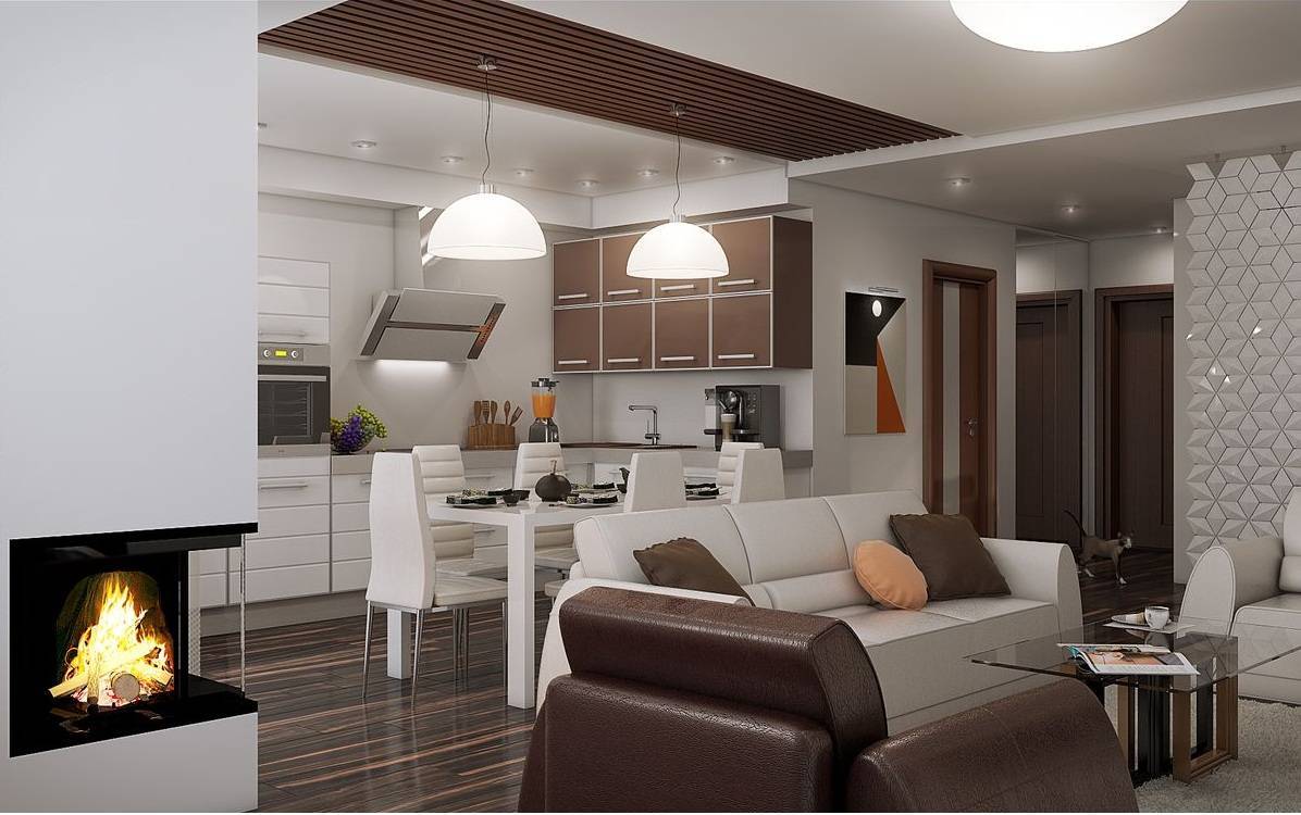 Для зонирования используют мебель, перегородки, освещение, цвета и фактуру отделочных материалов. Размер помещения позволяет выбирать любое из популярных стилевых решений.