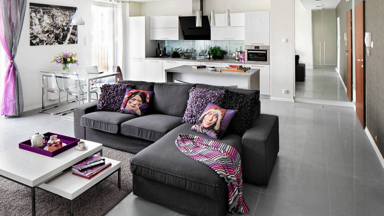 В зоне гостиной важно создать расслабляющую обстановку, поэтому для неё выбирают более дорогие материалы: паркет, ламинат, ковры. Для кухни нужны материалы, поддающиеся частому уходу: плитка, керамогранит