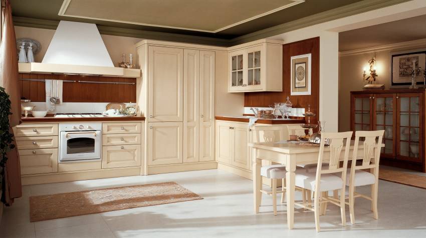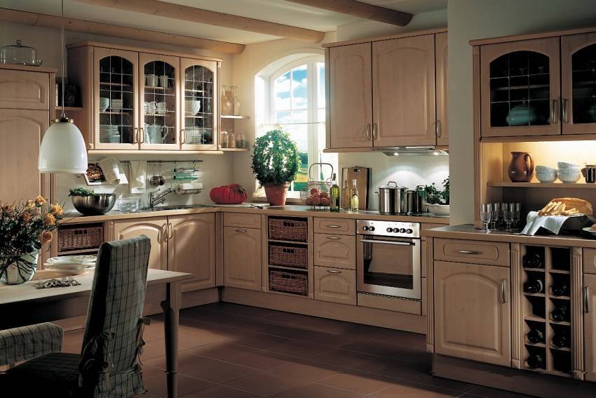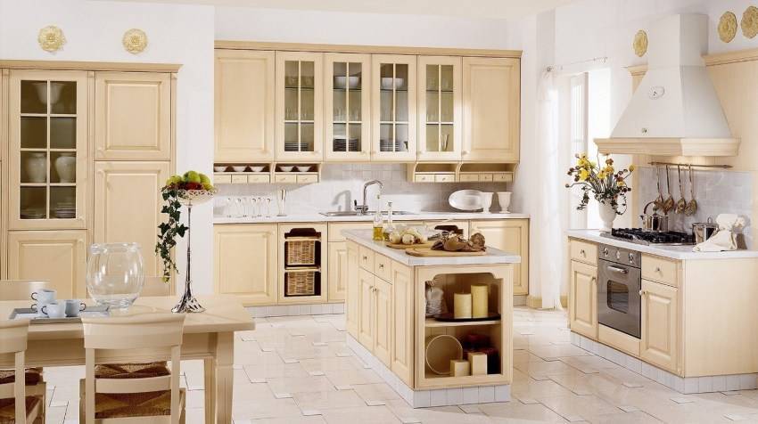 Наверное, в сознании большинства людей классический интерьер неминуемо ассоциируется как раз с бежевой кухней. По крайней мере, он идеально гармонирует с соответствующими принципами организации пространства и использующимися для отделки материалами (дерево, камень).