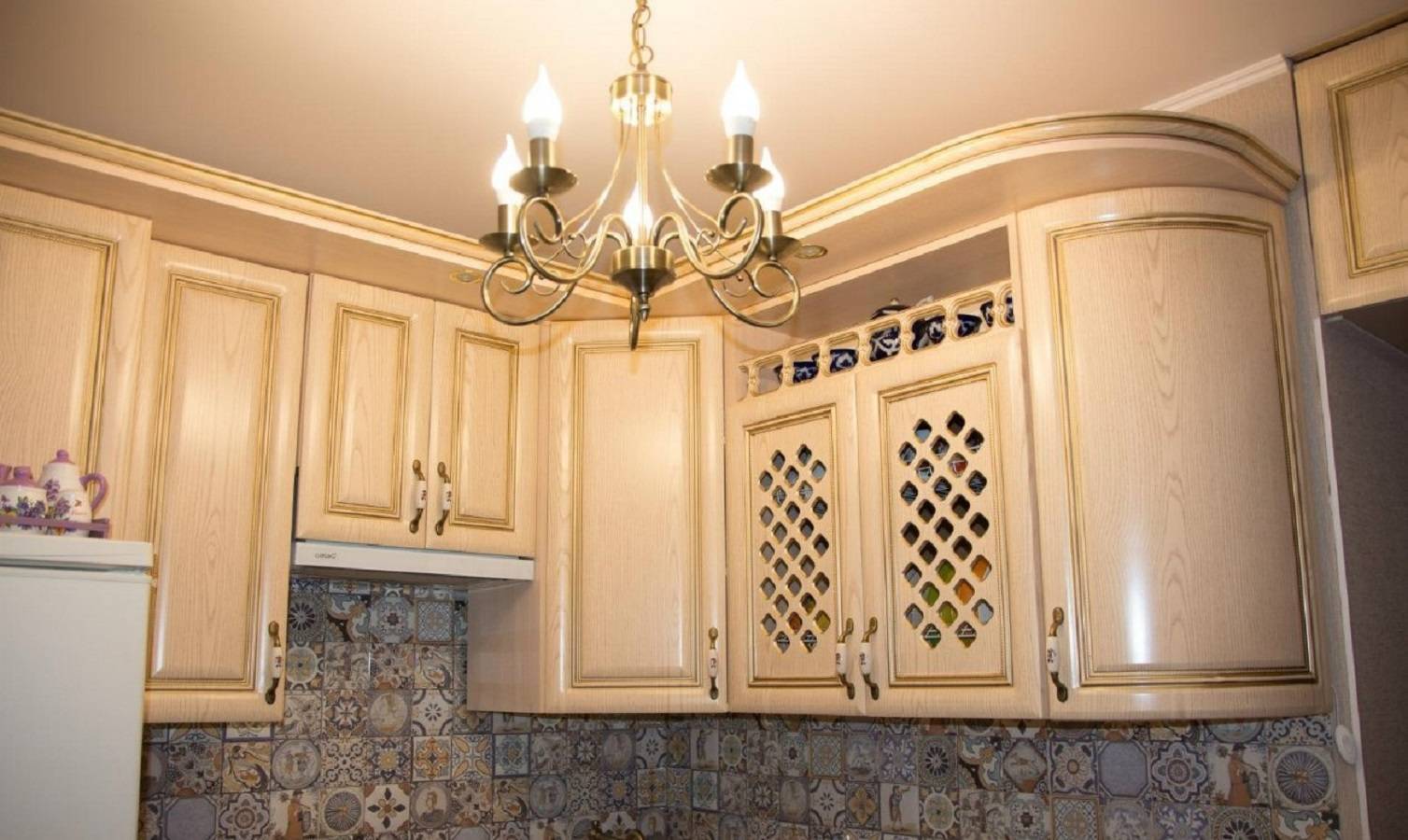 Для отделки кухонного гарнитура лучше всего выбрать такие материалы как шпон или дерево. Чтобы придать дверцам оригинальность, в качестве декора можно использовать витражное стекло или вообще заменить их на изготовленные из хлопка или льна занавески. Такой декор будет напоминать деревенский дом и на все сто процентов будет индивидуальным.