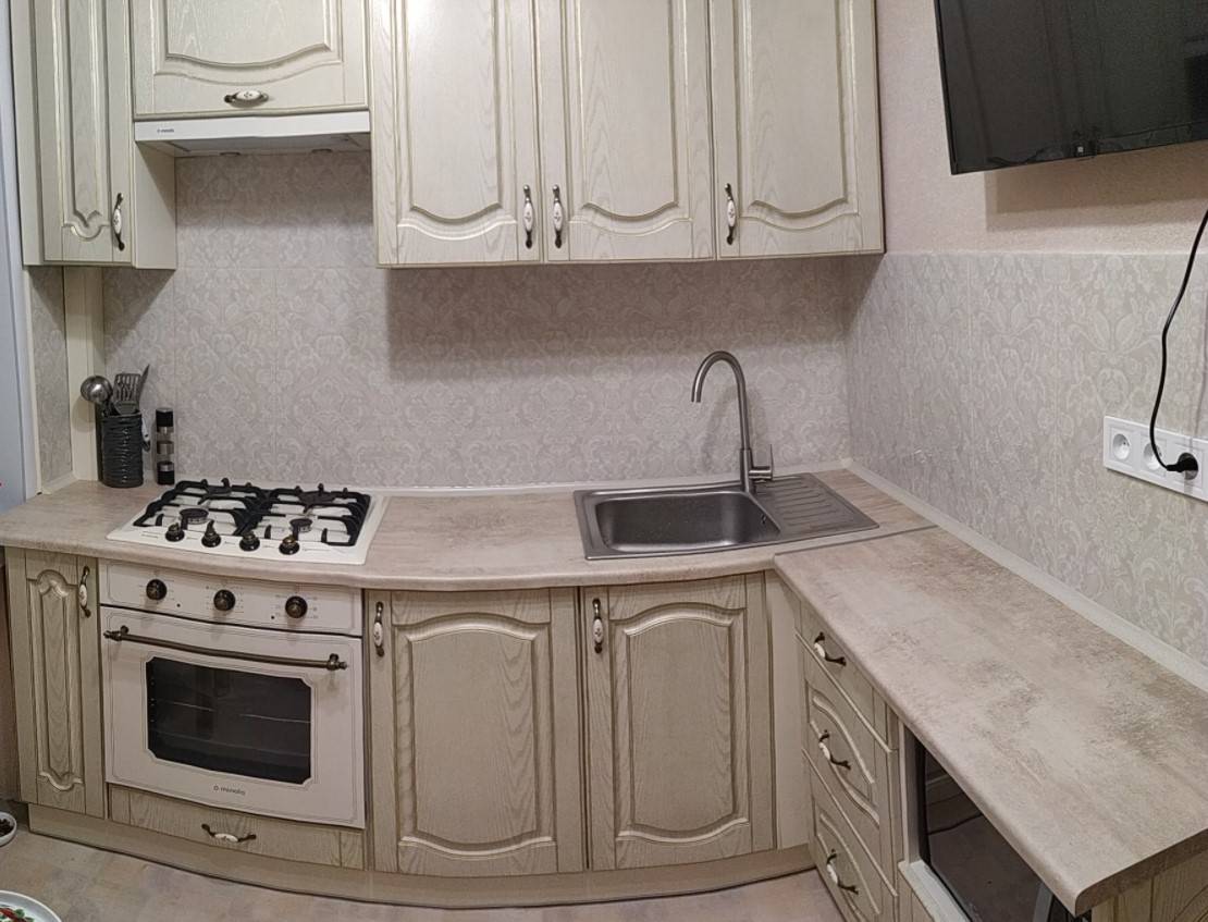 На фото маленькая кухня в бежевых и оливковых тонах.