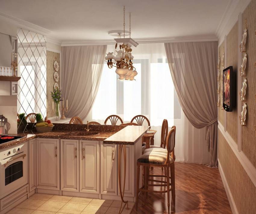 На фото полупрозрачные гардины на окне в интерьере бело-бежевой кухни.