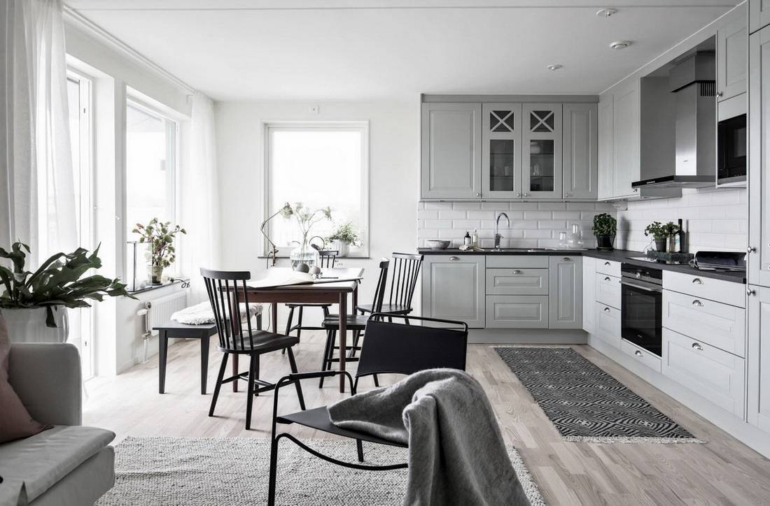 Поверхности из натурального дерева или его имитации добавят аристократичному, строгому и холодному серому цвету мягкости. Деревянными могут быть: фартук, столешница, пол или стол для обеда.