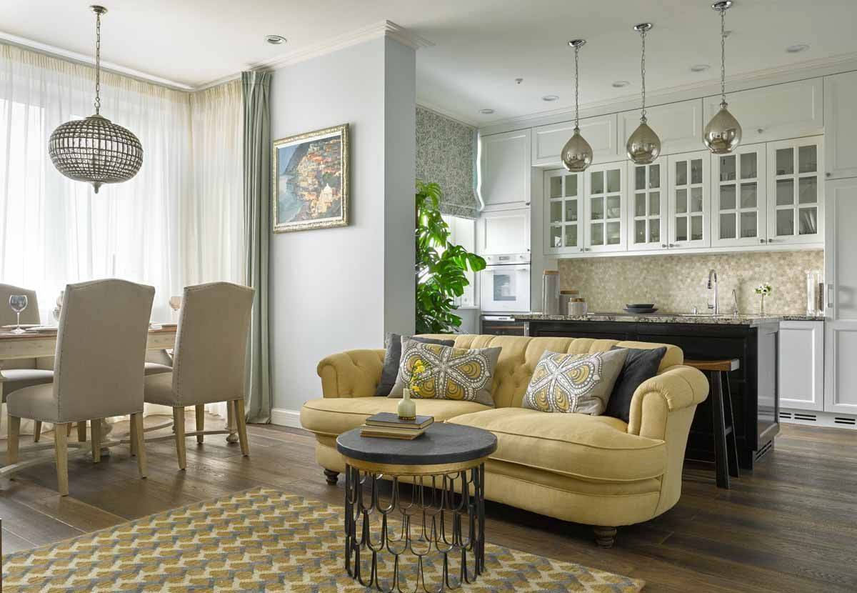 Классическая кухня, совмещенная с гостиной есть и будет находиться вне времени, что подтвердят эти фото.