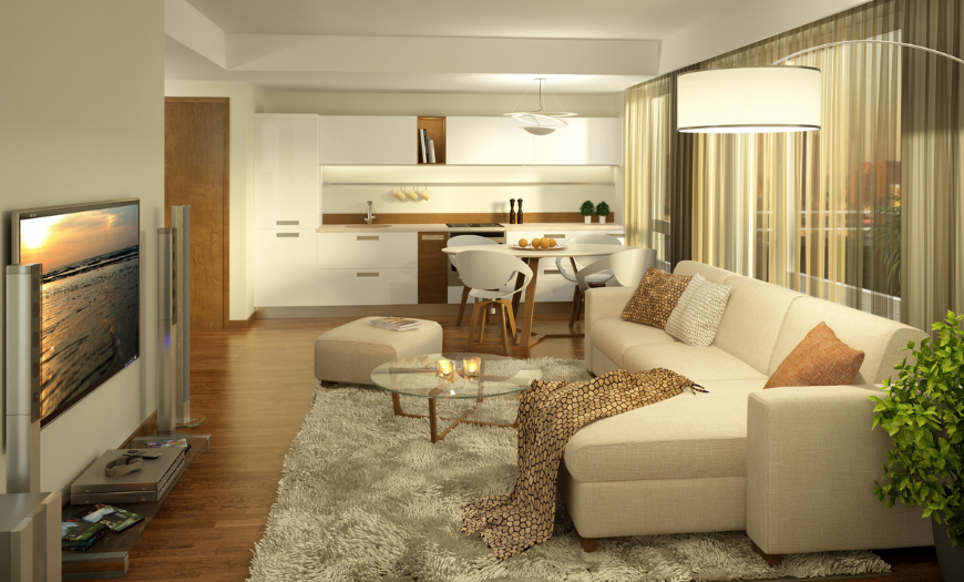Интерьер гостиной, совмещенной с кухней, принято разделять на функциональные зоны – кухонную, гостиную и столовую. Благодаря зонированию вы отделите царство хозяйки от королевства гостей и родственников, скроете от посторонних глаз процесс готовки и сможете по привычке уединиться на кухне.
