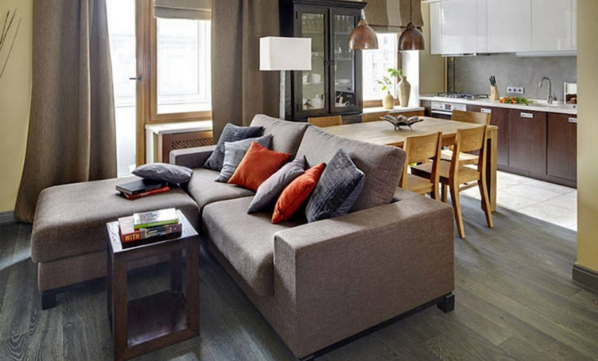Диван применяется в оригинальном дизайне гостиной, совмещенной с кухней, чаще как зонирующий предмет, ставится спинкой к месту приготовления еды. Подходит угловая или прямая модель.