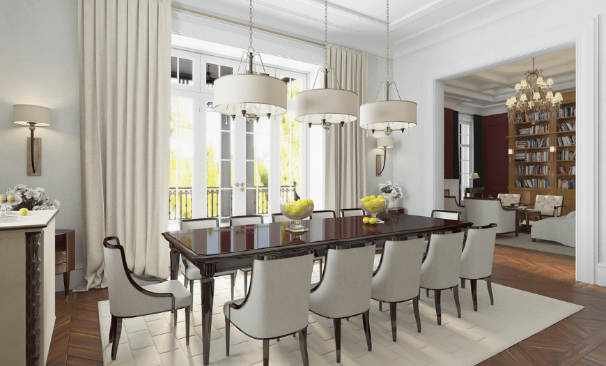Помещение в таком стиле, как правило, едино, если это большая столовая, то она должна быть разделена на несколько малых зон, причем зонированием будут выступать либо элементы декора, либо мебель. Стеновых панелей быть при этом не должно.