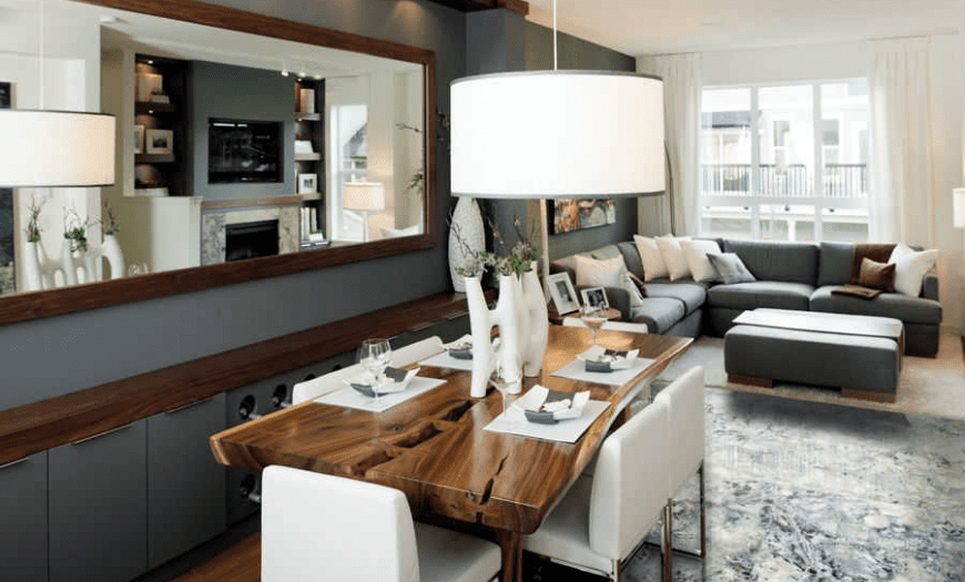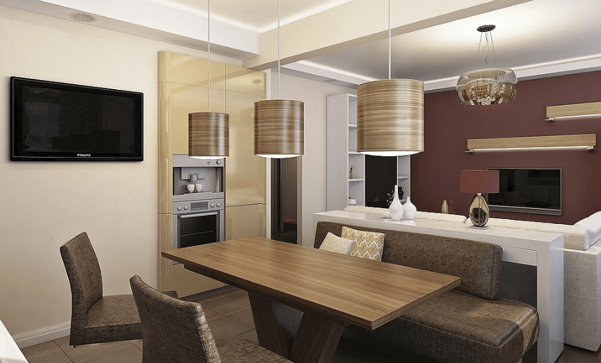 В комнатах небольших размеров столовую зону можно совместить с гостиной, свести к минимуму, заменив барной стойкой или вовсе исключить по ненадобности. Тут вы можете продолжить семейную традицию, организовав большой обеденный стол, или решиться на перемены в угоду простору.