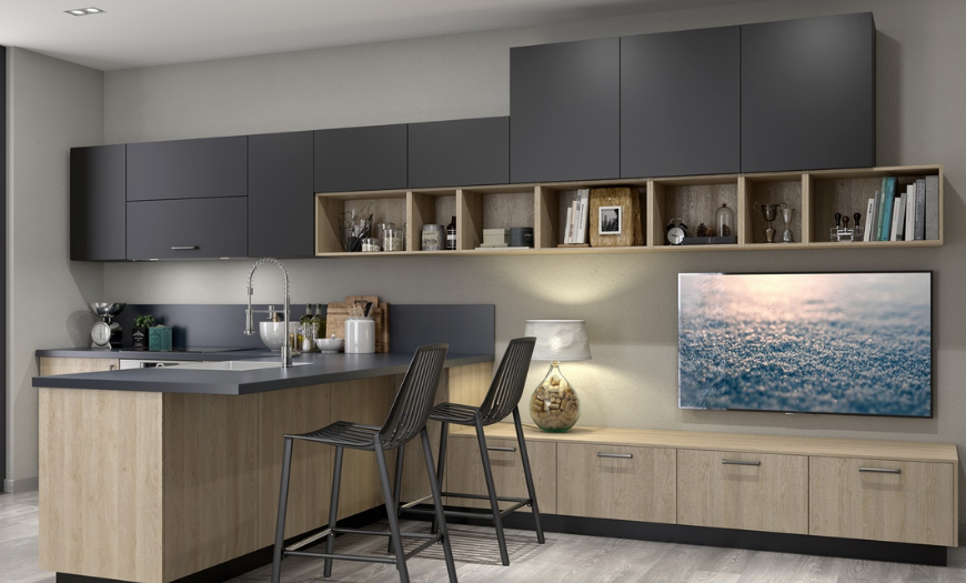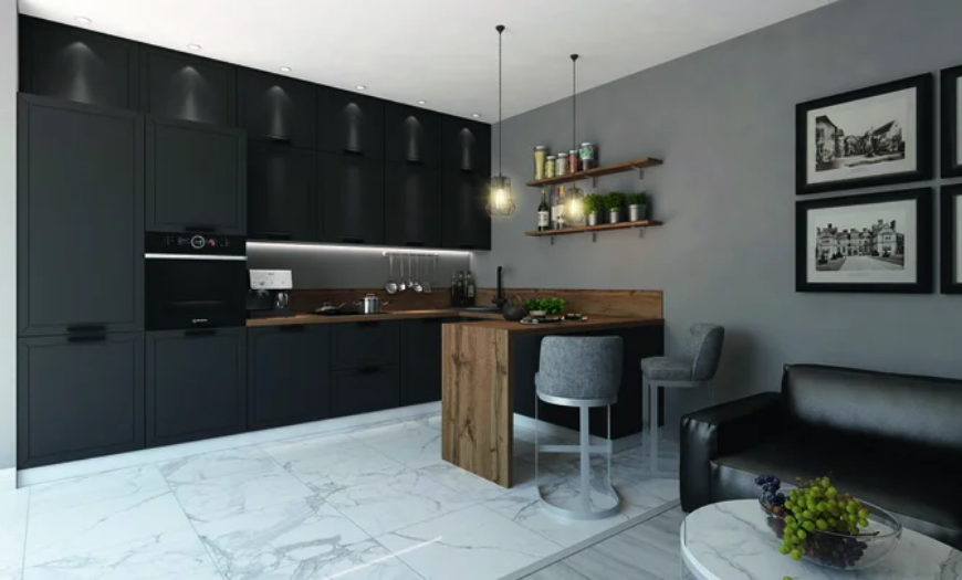 Конструкция должна быть функциональной, с закрытым фасадом. Ставят ее возле одной стены, обычно предпочитают П- или Г-образные модели. Если пространства много, можно поставить островок с рабочей поверхностью.