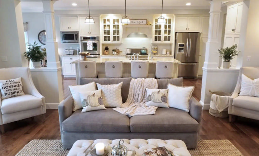 В частных домах обычно просторные комнаты, поэтому нужды гоняться за каждым квадратным метром нет. И это можно использовать с максимальной выгодой при оформлении дизайна кухни-гостиной. Присмотритесь к интерьерам, оформленным в стиле: