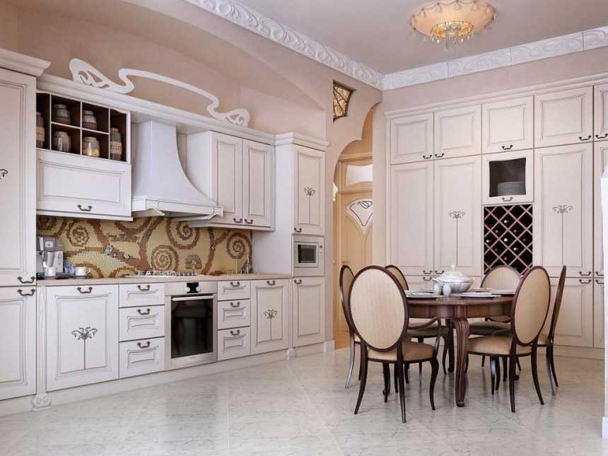 Весь декоративный потенциал таких стилевых направления можно раскрыть только на большой площади. Как вам такой дизайн интерьера кухни гостиной в классическом стиле?