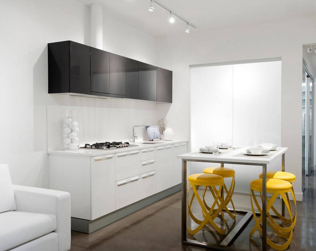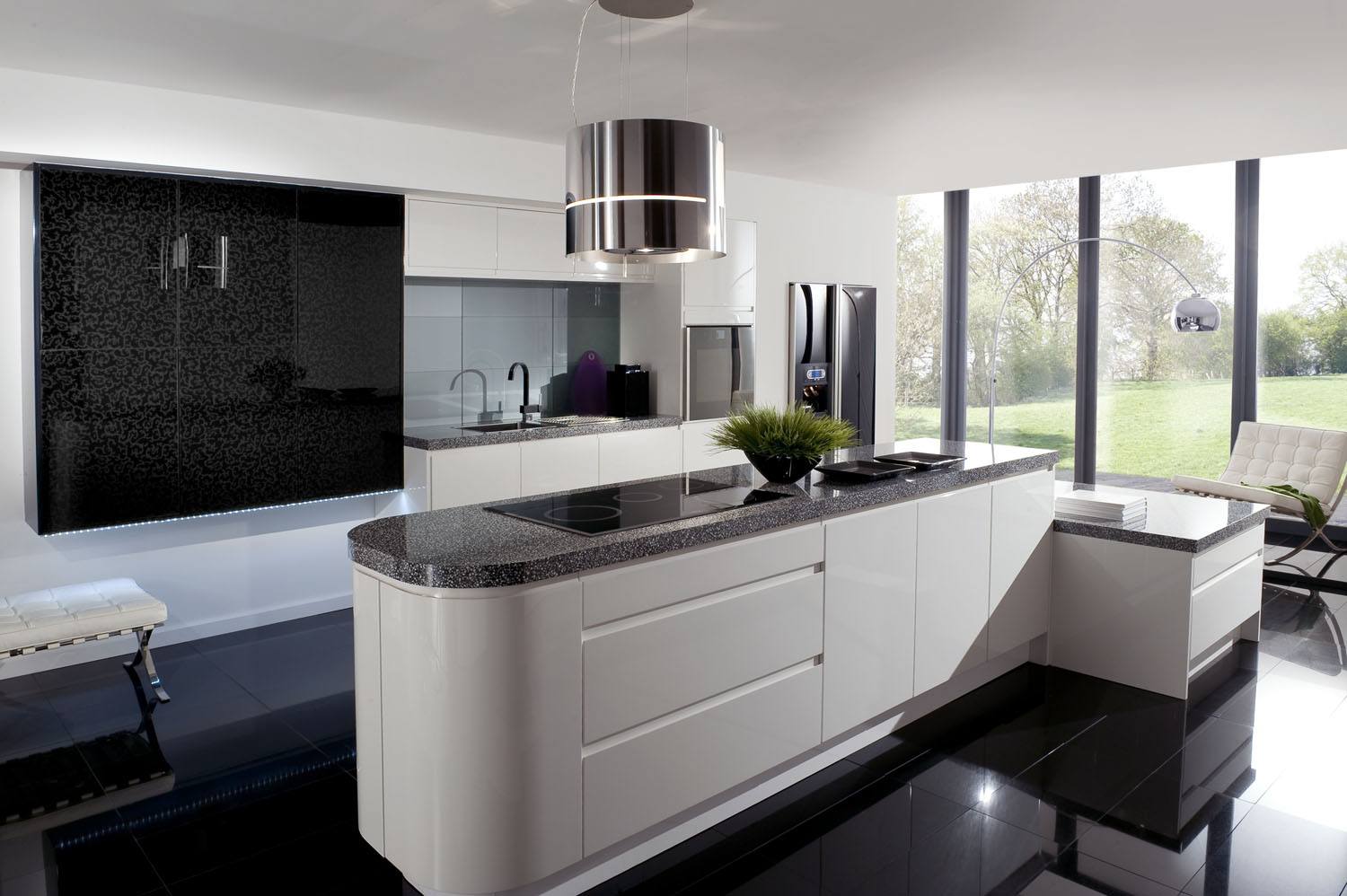 Создать впечатление гламура в интерьере вашей кухни поможет белая мебель с фрагментами темного дерева, объемные ручки, деревянные панели во всю стену или футуристические лампы