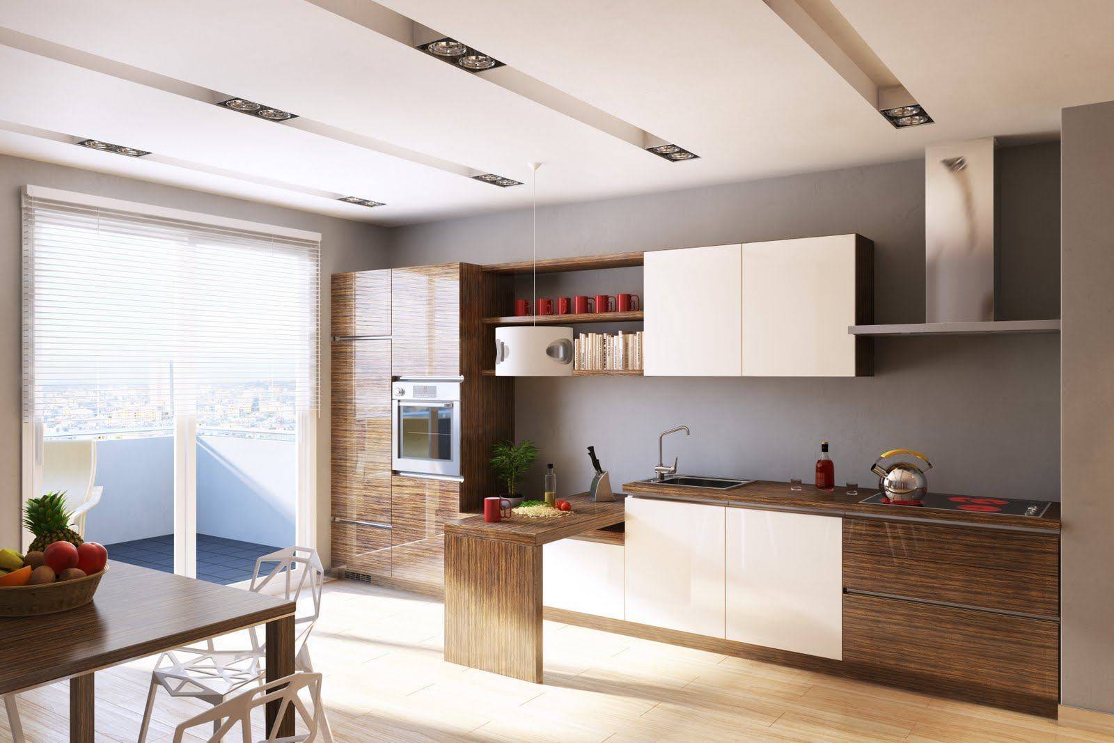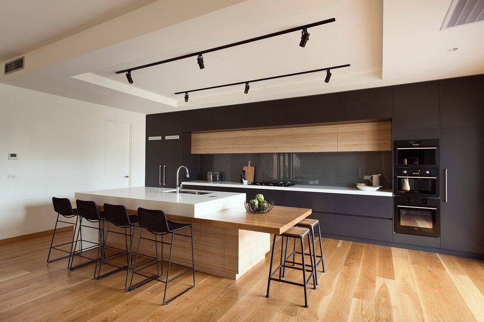 Вероятно, единственный приемлемый вариант для украшения потолка в кухонном стиле модерн — это однородный белый цвет. Это решение подходит для всех цветов интерьера — от полностью белоснежного до черного. Если высота позволяет, вы можете создать двухуровневый дизайн, но только в форме прозрачных прямоугольников или квадратов без какого-либо тщеславия.
