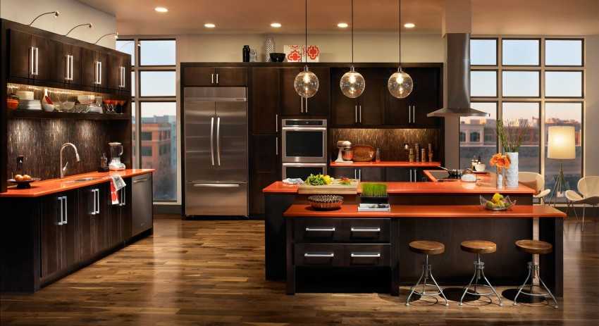 Оранжевый – нередкий гость на такой кухне. Здесь может использоваться и белая палитра в качестве фона, и более темные варианты – венге, шоколад, графитовый серый. Органичными будут обеденные группы из массива темного дерева в дуэте с оранжевым гарнитуров.