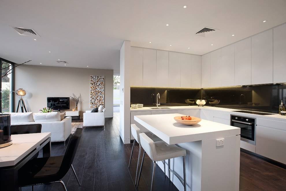 В современных интерьерах приветствуется объединение нескольких помещений в единое пространство. Кухня-гостиная позволит решить проблему нехватки площади в квартире. Комната с помощью дизайнерских приемов разделяется на зоны. Для этого используется отделка, цвет, освещение.