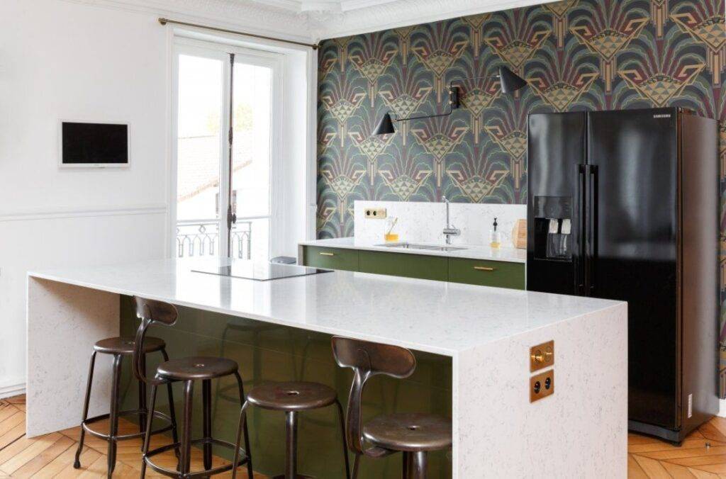 Интерьеры в стиле модерн часто сосредотачиваются на узоре, что делает его ключевым элементом в достижении внешнего вида. Узоры, которые широко использовались в интерьерах кухни, включали листья, ветви и перья; трапеции, шевроны и зигзаги; стилизованные животные и обнаженная натура; солнечные лучи и неровные, ступенчатые или заостренные края, напоминающие небоскребы.