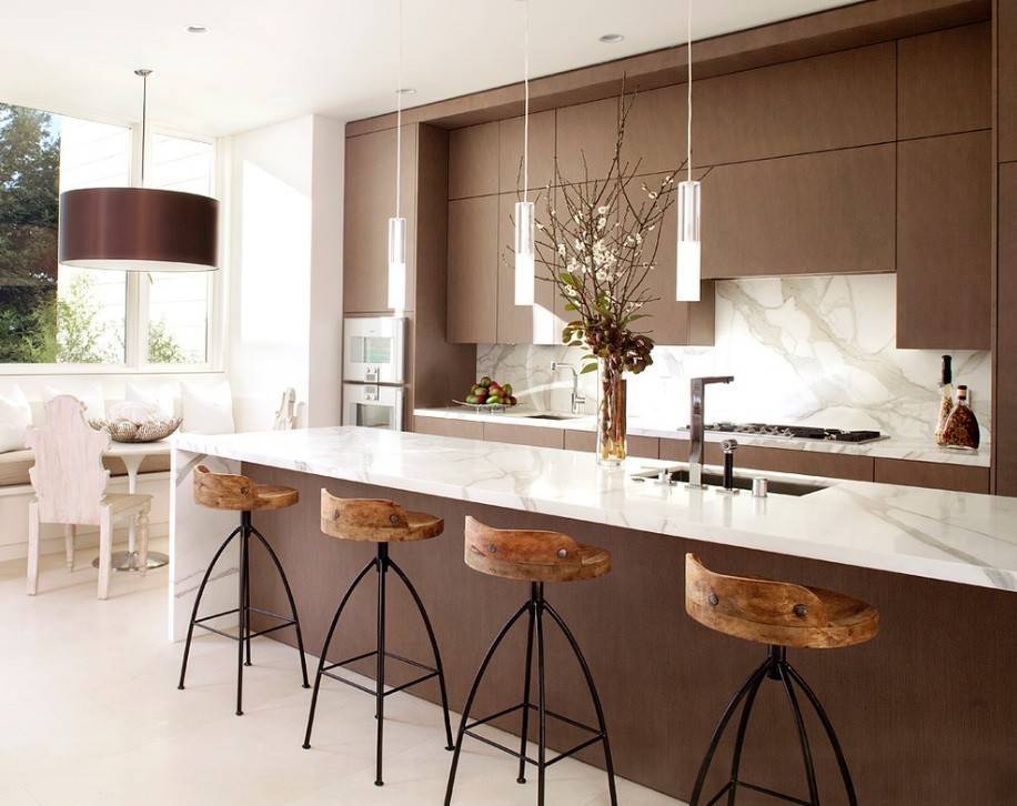 Все фото На фото: Двусторонняя барная стойка в интерьер кухни модерн на Рублёвке Массивная и широкая островная барная стойка из мрамора легко справится с ролью обеденного стола. Главное – укомплектовать ее мягкими стульями с возможностью регулировки высоты. А чтобы расширить функционал этого предмета интерьера, в стойку можно интегрировать систему хранения.
