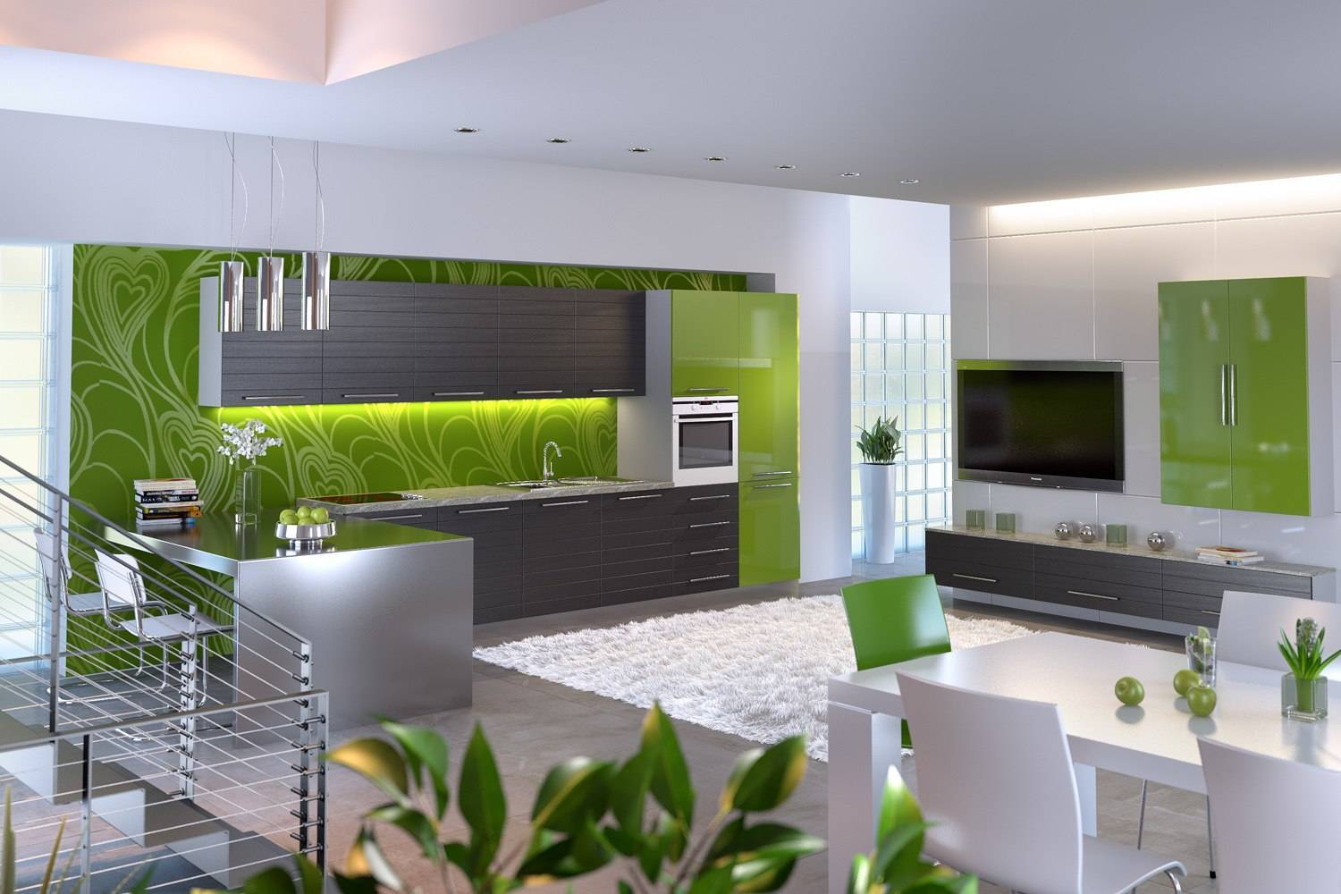 - Природным цветом и естественным для такой кухни является зеленый. В таком цвете могут быть фасады, диван, люстры, шторы, обои. Обеденные предметы – стол и стулья – при этом лучше предпочесть другого оттенка.