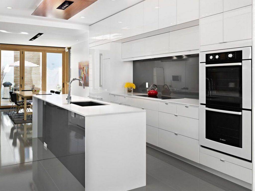 Как мы уже упоминали, классическая белая кухня с деревянной столешницей основана на различных тенденциях дизайна интерьера. Помимо стилей, вдохновленных природой и идиллическим климатом, вы также можете обставить светлую кухню в современном, даже минималистском интерьере. Современная белая кухня с деревянной столешницей порадует глянцевыми фасадами шкафов и хромированными элементами отделки.