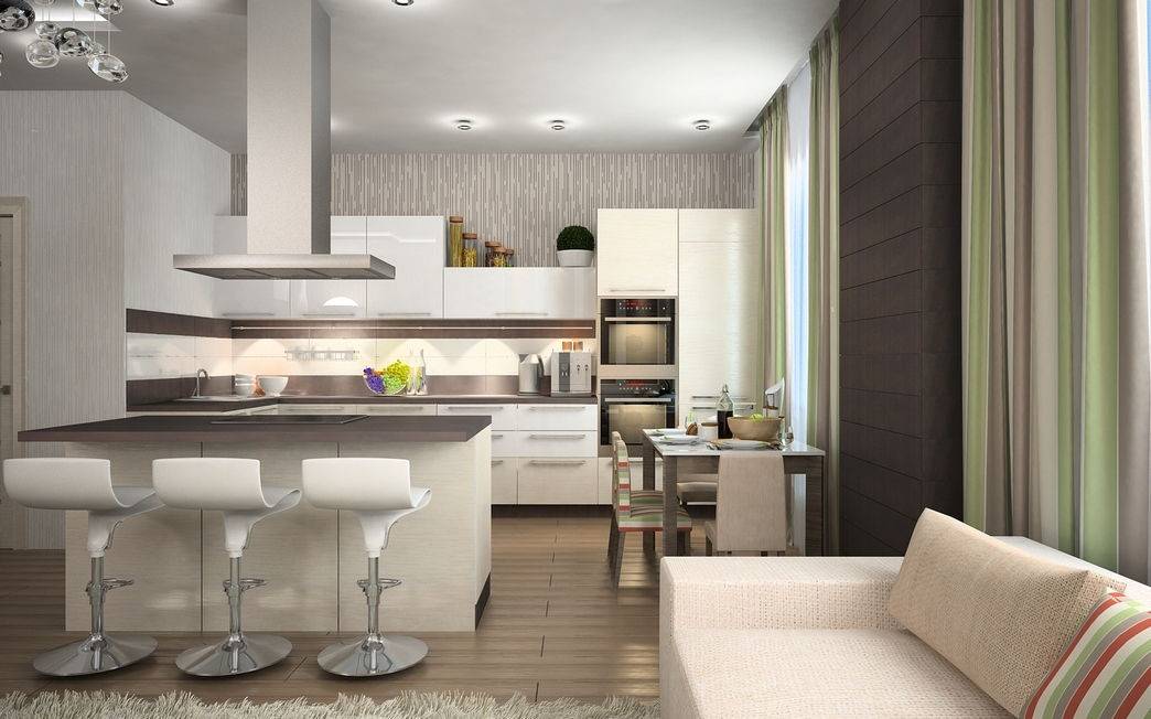 При необходимости, на обратной стороне вполне может оформляться небольшая по размерам обеденная зона, позволяющая расположиться на барных стульях двум или трём людям. Кухонный островок в столовой позволяет правильно разграничивать полезное пространство в двух помещениях, а с целью повышения эстетичности внешнего вида мойка или плита могут быть замаскированы расположенной рядом более высокой барной стойкой. В качестве дополнения, пространство помещения может разделяться при помощи разнообразной напольной отделки.