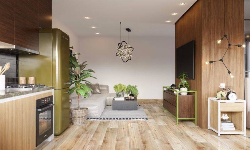 Потому что в квартире-студии нет дверей между комнатами, а значит стыковать разные напольные покрытия под дверьми не получится. А значит их выбор особенно важен.