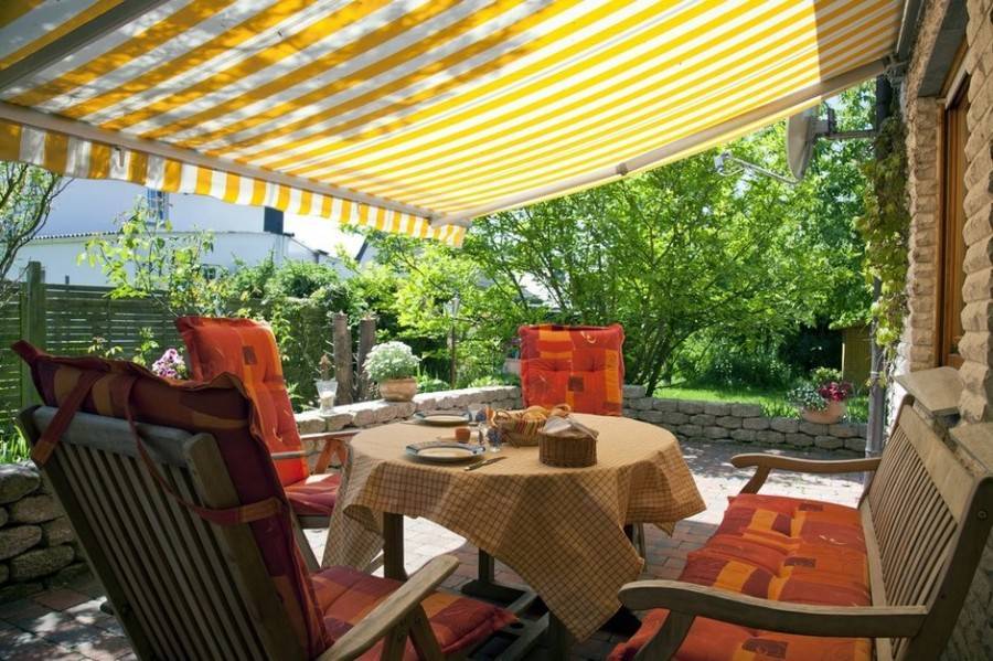Классическим вариантом является обустройство патио с навесом. Навес защитит площадку от осадков, ярких солнечных лучей, при этом обеспечит свободное передвижение воздуха.
