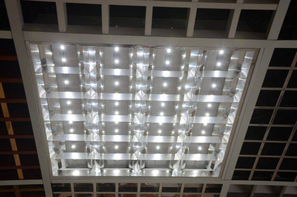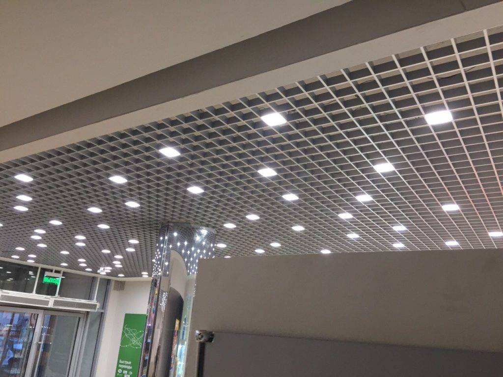 - Поскольку решетчатые подвесные системы существенно снижают высоту помещения, накладные и подвесные лампы должны иметь малую высоту, чтобы не занимать много полезного объема. Именно поэтому светодиодное освещение для решетчатых потолков достаточно популярно в не очень высоких помещениях – офисах, клубах, торговых центрах и пр.