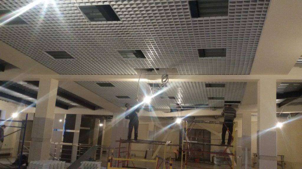 На завершающем этапе работ проводят выравнивание плоскости потолка путем регулирования подвесов и монтаж проводки. Для классических подвесных потолков Грильято используют растровые светильники, специально предназначенные для этого вида потолочного покрытия