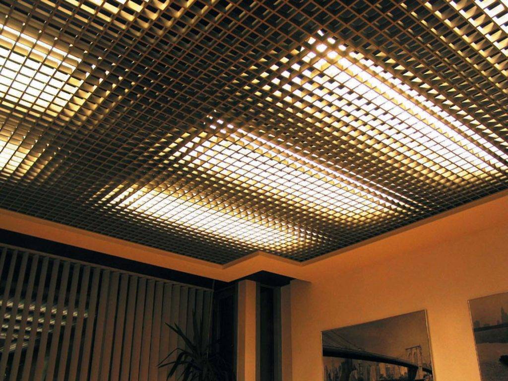 Ажурная решетка потолка позволяет смонтировать освещение за ней и добиться очень интересных эффектов.