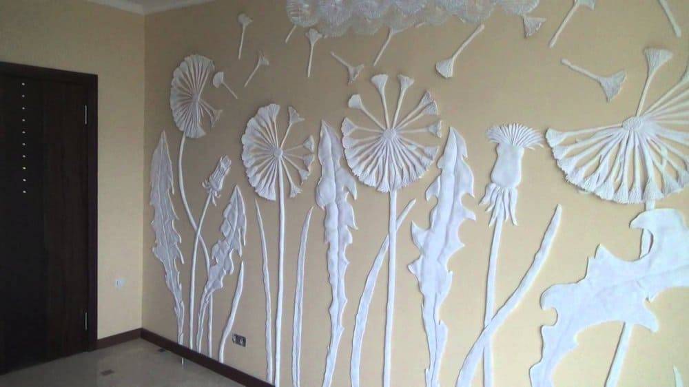 На фото часто можно увидеть на стенах барельефы с обилием цветов. Необязательно вылепливать каждый цветок отдельно – их можно сделать из ткани или бумаги и просто покрыть смесью из гипса и ПВА. После высыхания элементы крепятся к основной композиции с помощью густого алебастра.